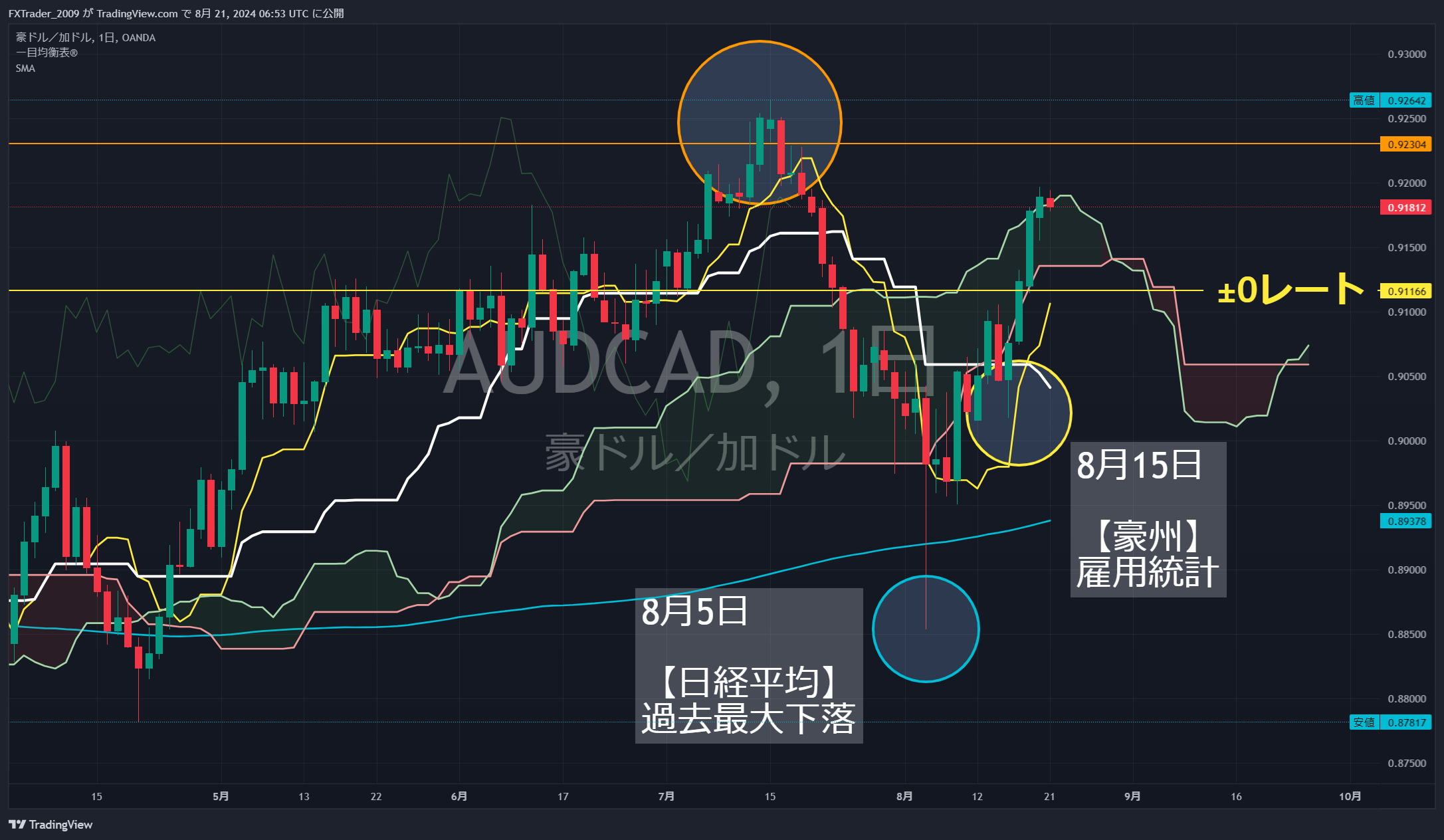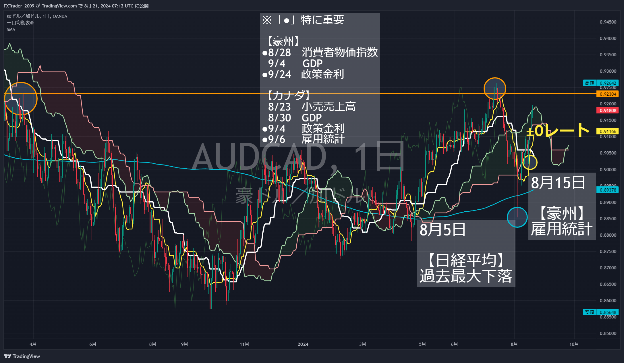 損切りルールは『約35%(急変相場はこの限りではありません。)』と設定しておりますが、前回の高値付近(オレンジ丸)である『0.92600』付近となります。